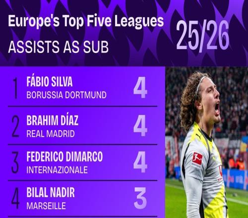 據統計,法比奧-席爾瓦、卜拉欣-迪亞斯和迪馬爾科是本賽季歐洲五大聯賽作為替補送出助攻并列最多的球員。2025...