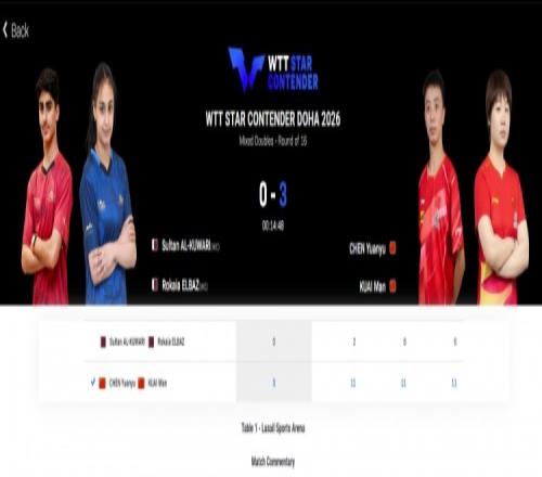 體育播報1月15日宣 2026年WTT球星挑戰賽多哈站混雙1/8決賽,陳垣宇/蒯曼3-0庫瓦里/埃爾巴茲,晉級八強。