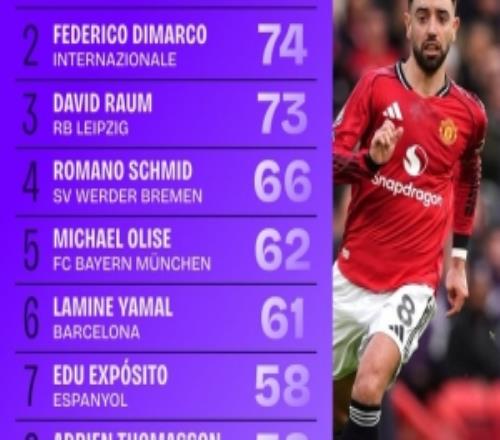 體育播報3月3日宣 Squawka數據統計顯示,B費是本賽季五大聯賽創造機會最多的球員。1.B費(曼聯)84次2.迪馬爾科(國...