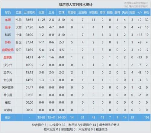 全場結束,活塞104-103險勝凱爾特人。這場不是飆分大戰,但是非常精彩。布朗空砍32分11板2助,兩罰不中太可惜。懷特在進攻端一言難盡,11中1得到4分9板5助2帽。哈里斯25分3板、杜倫18分9板、坎寧安16分3板14助2帽。
