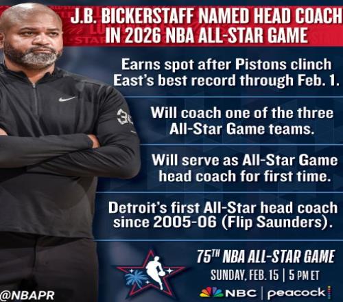 活塞官方曬出海報祝賀比克斯塔夫,同時配文寫道:“比克斯塔夫將正式擔任26年NBA全明星賽主教練!”