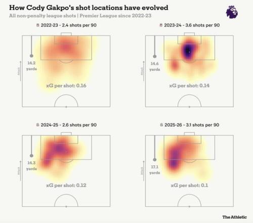 數據同樣印證了肉眼所見。加克波下滑的一個關鍵原因是射門選擇。下面的射門分布圖顯示,他更多選擇在禁區左側邊緣、距離較遠的位置進行冒險射門,而不是進入更具威脅的中路區域。