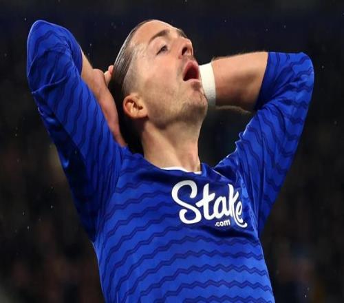 埃弗頓的杰克-格拉利什在對(duì)陣諾丁漢森林的英超比賽中做出反應(yīng)。