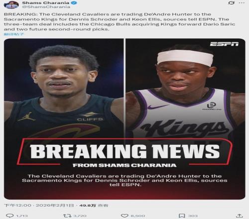北京時間2月1日中午12點,據NBA名記Shams報道,騎士、國王和公牛達成一筆三方交易:騎士隊將德安德烈-亨特交易至薩克拉門托國王隊,換來丹尼斯-施羅德和基翁-埃利斯。此外,國王將薩里奇和2個次輪簽送到芝加哥公牛隊。