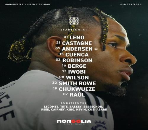 富勒姆首發(fā):1-萊諾、21-卡斯塔涅、5-安諾生、15-昆卡、33-羅賓遜、16-貝格、17-伊沃比、8-哈里-威爾遜、32-史密斯-羅、19-丘庫埃澤、7-勞爾-希門尼斯