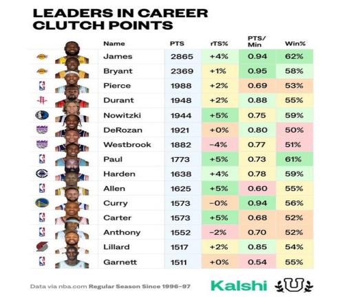 2月1日。有媒體統(tǒng)計并公布了一個數(shù)據(jù),那就是關(guān)鍵時刻的總得分和勝率。關(guān)鍵時刻就是最后五分鐘內(nèi)雙方比分差距在5分以內(nèi),這種時刻比末節(jié)和加時賽更能體現(xiàn)一個球員的心理素質(zhì)和硬解能力。