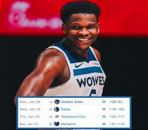 賽后森林狼官方發文到:“我們拿到了西部目前現存最長的連勝—4連勝。”