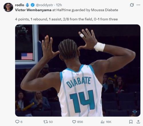 而跟文班亞馬對位的2022年次輪43順位的中鋒迪亞巴特,全場比賽33分鐘,9中6,拿到12分10籃板6助攻2蓋帽,命中率66.7%,正負值+17,文班亞馬2.24米,迪亞巴特只有2.08米,兩人的強硬程度完全不同。