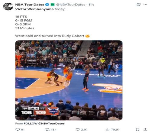 全場比賽文班亞馬31分鐘,15中6,三分3中0,拿到16分8籃板1助攻1搶斷0蓋帽,正負值-14,命中率40%。