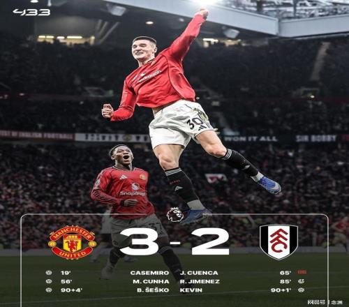 英超第24輪,曼聯(lián)主場(chǎng)3-2絕殺富勒姆,三連勝升第4。庫(kù)尼亞造點(diǎn)被改判,B費(fèi)助攻卡塞米羅頭球破門(mén)首開(kāi)紀(jì)錄,卡塞米羅助攻庫(kù)尼亞抽射擴(kuò)大比分,謝什科替補(bǔ)中柱,馬奎爾送點(diǎn),希門(mén)尼斯點(diǎn)射扳回一城,凱文世界波扳平比分,B費(fèi)助攻謝什科抽射完成絕殺。