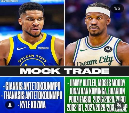 具體交易內(nèi)容為:勇士得到字母哥+字母哥哥+凱爾庫茲馬,雄鹿則得到吉米巴特勒+摩西穆迪+喬納森庫明加+布蘭丁波杰姆斯基+2026年、2028、2030、2032首輪簽+2027、2029、2031首輪互換權(quán)。