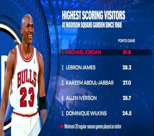 麥迪遜客場球員場均得分:喬丹31.8分高居榜首詹姆斯28.2分第二