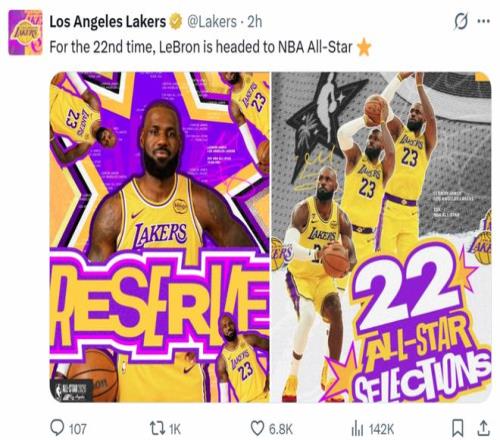 賽前NBA官方公布全明星替補名單,詹姆斯連續22年入選刷新自己保持的NBA歷史第一紀錄,湖人官方第一時間曬圖慶祝。