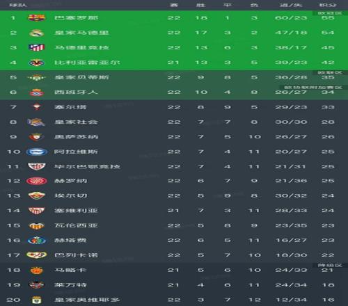 北京時間2月2日,西甲第22輪結束了9輪比賽,我們看看最新積分榜變動!