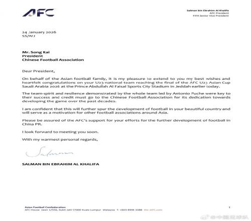 薩爾曼在來函中表示:“主教練安東尼奧率領的隊伍在比賽中展現出了極強的團隊精神與堅韌品格,正是隊伍在本屆賽事中取得優異成績的關鍵所在。此項成就也應歸功于中國足球協會過去數十年來為推動中國足球事業發展所付出的不懈努力。”同時,他確信中國隊在U23亞洲杯上取得的突破將進一步助力中國足球事業的發展。