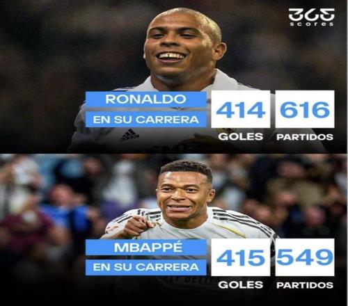 這場雙響之后,365Scores給出的對比數字很直接:羅納爾多(外星人)生涯616場414球,姆巴佩生涯549場415球。也就是說,姆巴佩在少踢將近70場的情況下,把外星人的生涯總進球追平并反超。