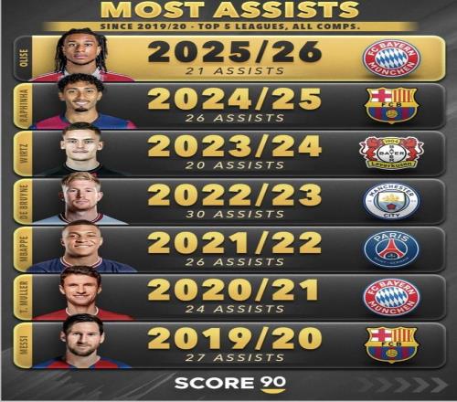 最近Score90做了五大聯賽、所有賽事口徑的助攻盤點。2025/26賽季還在進行中,奧利塞這段時間的表現已經把“助攻王”的氣勢打出來了:他不只是暫時領跑,而是用連續不斷的輸送把領先優勢先拉開,節奏也明顯更快。更關鍵的是,這種表現放到更長的時間軸里也站得住——他已經進入近些年單賽季助攻王的序列,和那些曾經把助攻做到極致的名字并列。賽季接下來怎么走,他能不能把這種節奏一直保持下去,是這組內容最值得關注的地方。(數據截至北京時間2026年1月25日)