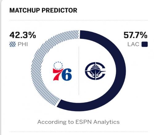 ESPN對本場勝率進行了預測,快船勝率為57.7%,76人則是42.3%。