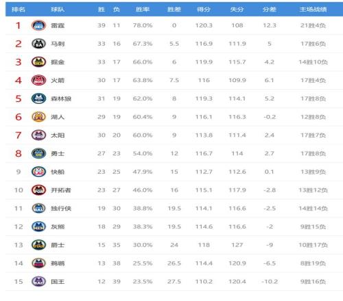 雷霆贏球后39勝11負排名聯盟第一,掘金輸球后33勝17負,排名從西部第二掉到第三,今日贏球的馬刺成為第二。掘金、湖人、太陽今日都輸球,給西部第四的火箭送上大禮,火箭和掘金的差距縮小到1.5個勝場,火箭領先湖人、太陽的優勢來到1.5個勝場。