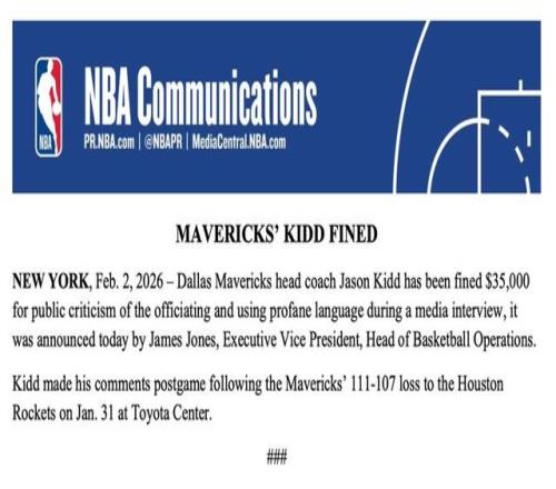 北京時間2月3日,NBA官方宣布,獨行俠隊主教練杰森-基德因在媒體采訪中公開批評裁判執法并使用污言穢語,被處以35000美元罰款。