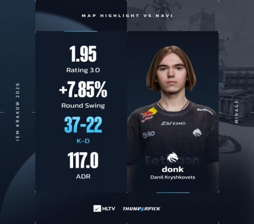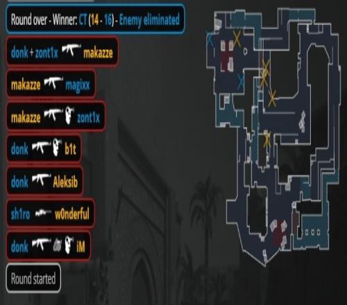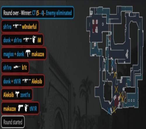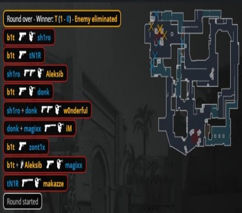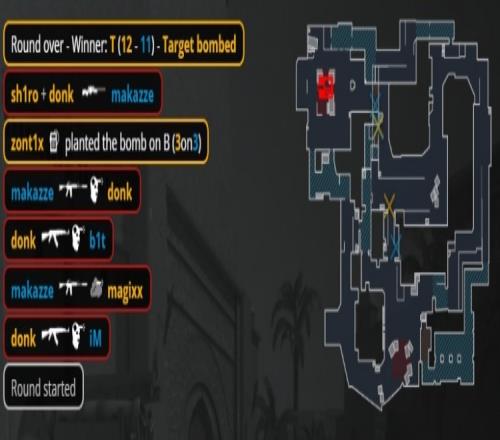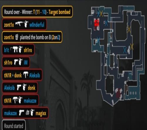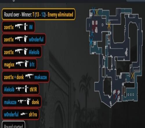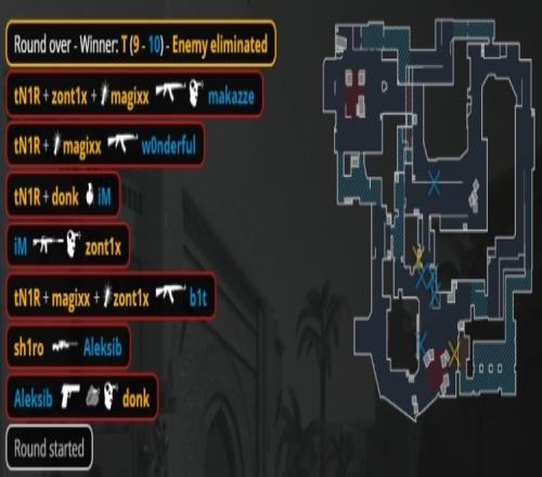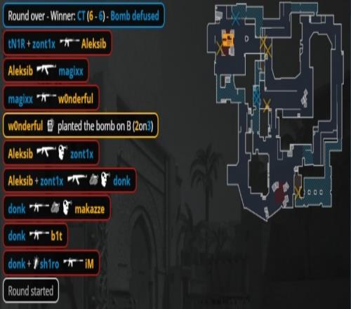 最終donk下水道先殺iM,隨后donk回A轟掉A二樓b1t,再喊隊友炸煙換掉VIP樓下的makazze,小李子拱門雙殺,wonderful進B下包后被magixx擊殺,小李子殘局1v3無力回天,雙方6-6戰平。