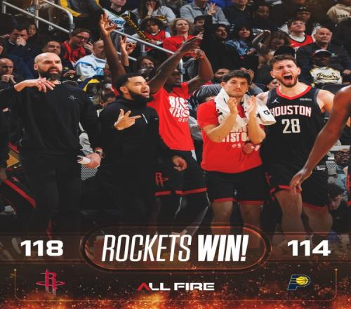 賽后火箭發(fā)布贏球海報(bào),替補(bǔ)席慶祝瞬間成為封面,范弗里特、芬尼-史密斯、謝潑德和申京都入鏡,還有一位火箭助教。