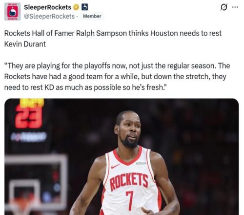 火箭名宿桑普森對此一針見血的點評道:“火箭該為季后賽而戰(zhàn),不要僅僅著眼于常規(guī)賽,他們必須盡可能讓杜蘭特獲得更多休息時間,確保他以滿血狀態(tài)出戰(zhàn)季后賽。”