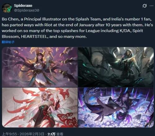 體育播報2月3日宣 X上爆料LOL原畫團隊首席插畫師CHENBO在為拳頭工作十年后于1月底離職。包括EDG冠軍皮膚、距離最近的新英雄亞恒的原畫以及刀妹的玉劍仙、剪紙仙靈等多款皮膚原畫都出自他的手筆。