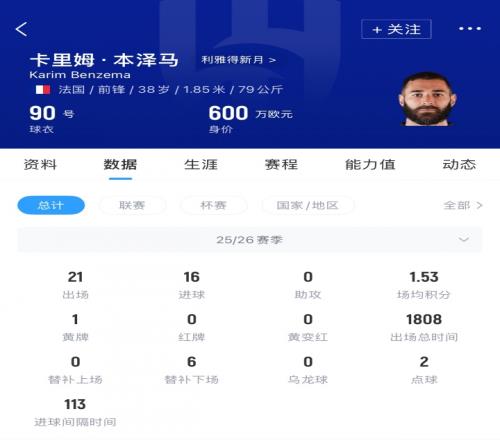 本賽季,本澤馬各賽事21場打進16球,其中沙特聯14場8球,亞冠精英聯賽4場4球。本澤馬此前在吉達聯合罷賽2場,下輪沙特聯可能迎來復出,隨利雅得新月客戰阿科多。