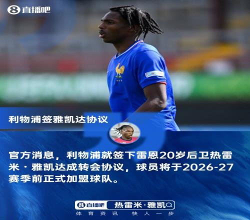 利物浦已就簽下雷恩后衛熱雷米?雅凱達成轉會協議,這位球員將于2026-27賽季前正式加盟球隊,此次轉會仍需完成工作許可申請與國際轉會證明辦理。