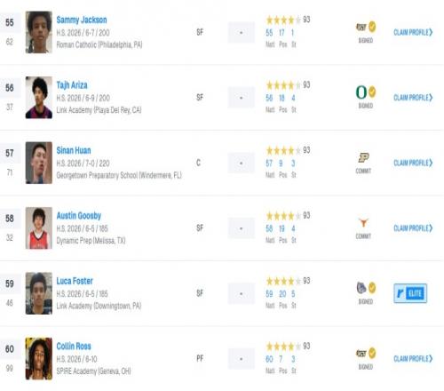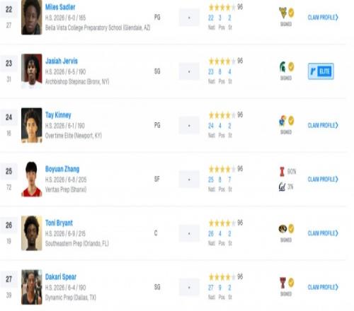 選秀網站Rivals26屆全美高中生排名:張博源升至第25郇斯楠第57