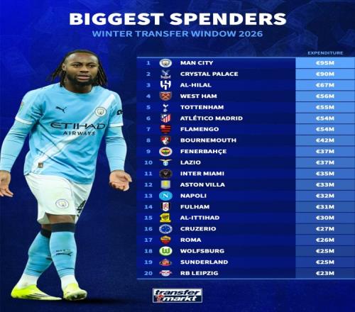 冬窗引援花費排行:曼城9500萬歐居首,邁阿密國際3500萬歐第11