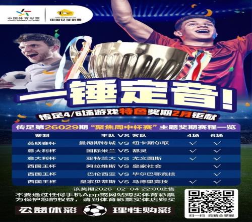 第26029期傳足4/6場游戲特色獎期已經于2026年2月1日20:00開售,將于2026年2月4日22:00停售,并于2026年2月6日開獎,其中曼徹斯特城VS紐卡斯爾聯、國際米蘭VS都靈、亞特蘭大VS尤文圖斯和皇家貝蒂斯VS馬德里競技為4場進球游戲競猜賽事。