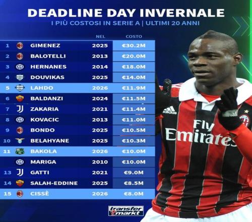 北京時間2月3日,德轉統計出了2006年以來意甲冬窗截止日最貴的15筆交易,AC米蘭2025年冬窗3020萬歐元引進圣地亞哥-希門尼斯排名第一,2013年AC米蘭2000萬歐元引進巴洛特利排名第二,國際米蘭2014年1800萬歐元引進埃爾納內斯第三。
