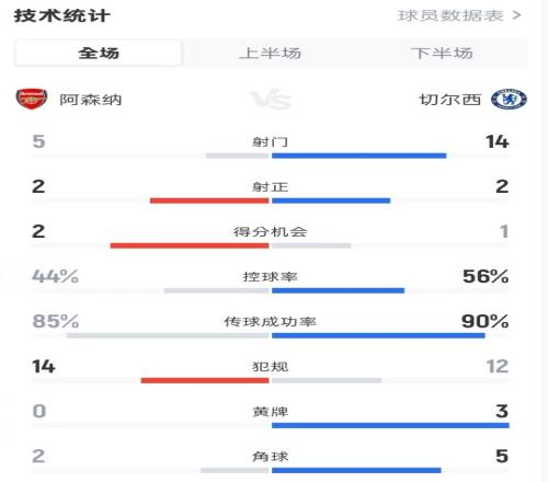阿森納10切爾西全場數據:射門514,射正22,控球率44%56%