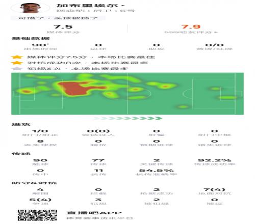 加布里埃爾本場數(shù)據(jù):8次對抗成功全場最多,評分7.5并列最高