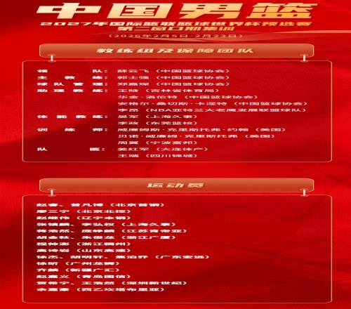 為備戰國際籃聯2027籃球世界杯預選賽第二窗口期比賽,中國籃球協會計劃于2月5日至2月23日在國家體育總局訓練局組織國家男籃集訓。中國籃協于今日公布了本次男籃集訓大名單,我俱樂部球員賀希寧和王浩然入選,祝愿他們在國家隊集訓中不斷突破,為國爭光。