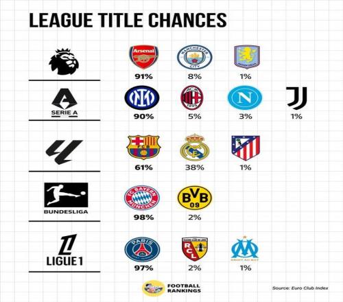 雖然本賽季還有十幾輪才會結束,不過,在五大聯賽的對比各領跑者的姿態是越發的明確了。就此,數據機構EuroClubIndex也是給出了預測,就五大聯賽奪取獎杯的幾率給出計算。