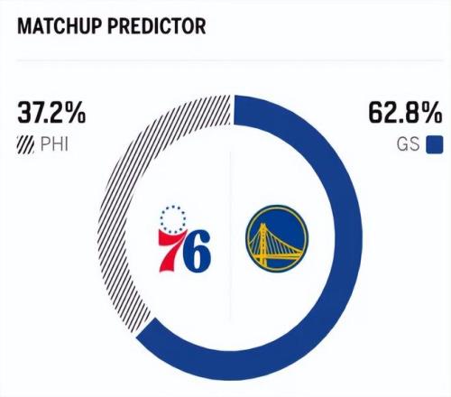 這是兩隊(duì)本賽季的第二次交手,上一次在76人主場(chǎng)的交鋒中,勇士以1分之差憾負(fù)。賽前,美媒ESPN對(duì)本場(chǎng)比賽進(jìn)行了勝率預(yù)測(cè),勇士隊(duì)勝率意外高達(dá)62.7% ,優(yōu)勢(shì)明顯,76人隊(duì)勝率則僅為37.3% ,讓人詫異 。