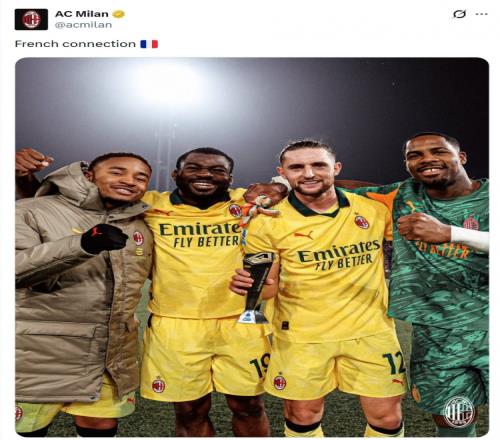此役恩昆庫破門、拉比奧特傳射、邁尼昂完成零封,尤索夫·福法納則踢滿全場,米蘭官方社媒賽后曬出這四名法國球員的照片,配文:“法國幫。”