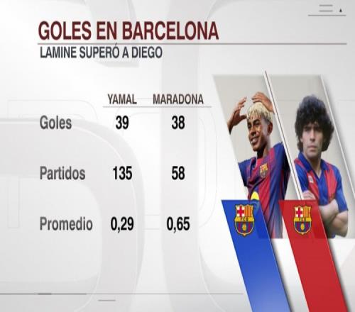 據ESPN統計,18歲亞馬爾已經為巴薩打進39球,巴薩生涯進球數量超越馬拉多納(38球)。
