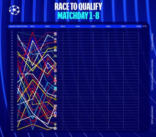 歐冠官方曬聯(lián)賽階段排名走勢(shì):阿森納、拜仁最穩(wěn)定