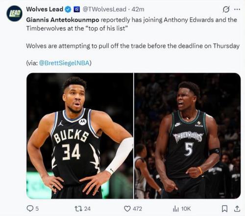 隨后NBA記者Brett Siegel報道,揚尼斯把加盟森林狼搭檔愛德華茲視為自己的首選,森林狼也正在努力推動揚尼斯的交易。