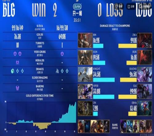 第二局比賽雙方前期有來有回,中期Jiejie劍魔閃現撞墻白給,BLG趁機拿下大龍!WBG強行留人先打出人數優勢,但是殘局Xun潘森和knight加里奧實在是太能打了!兩人合力把人數打成局勢,回頭knight加里奧回城TP還留住了Xiaohu辛德拉!隨后中路又是Jiejie劍魔被強殺,BLG拿下第五條小龍沒讓WBG收下海克斯龍魂!最終的龍魂團ON牛頭團前先倒,但是Viper蕓阿娜灌傷害配合隊友先秒Xiaohu辛德拉,Jiejie劍魔搶龍失敗,knight加里奧繞后閃現嘲諷留住Elk卡莎,打出2換3的BLG從下路一波結束比賽!橫掃對手,終結了WBG的連勝態勢!
