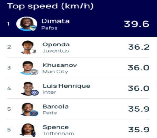 第三個,28歲的迪馬塔應該是中超速度最快的球員了。本賽季他在歐冠就創造了39.6公里每小時的沖刺速度,排在本賽季歐冠沖刺速度第一名,斷崖式領先,甚至不輸一些短跑運動員,堪稱“足壇博爾特”,來中超這速度就是降維打擊了。
