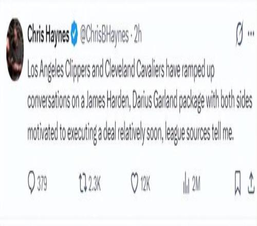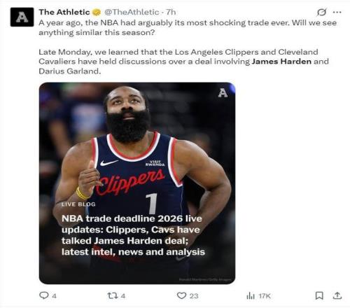 北京時間2月4日,據知名記者沙姆斯·查拉尼亞報道,NBA交易市場完成一筆引人關注的交易:洛杉磯快船隊將詹姆斯·哈登送至克利夫蘭騎士隊,換回后衛達里厄斯·加蘭和一個2026年的次輪選秀權,這筆涉及全明星后衛互換的交易,標志著兩支球隊在賽季中期選擇了不同的發展路徑。