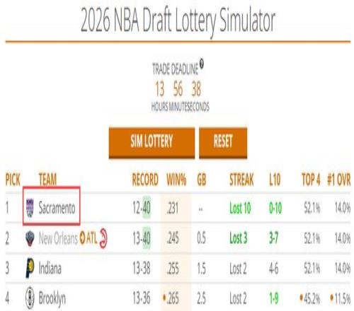 國王目前12勝40負聯盟倒數第一,2026年前四順位簽52.1%,狀元簽概率14%。國王很有希望在2026年夏抽中前三順位。