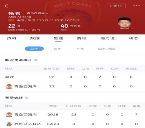 楊希出道于西班牙人青訓(xùn),場上主要司職右后衛(wèi)。2025年1月回國加盟青島西海岸,上賽季代表青島西海岸出戰(zhàn)23場比賽,目前20歲的楊希德轉(zhuǎn)身價為40萬歐元。國家隊方面,楊希代表中國各級國家青年隊都有過出場。