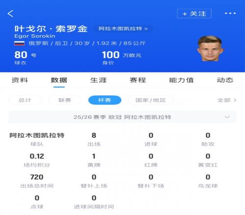 2024年7月,索羅金加盟哈薩克斯坦阿拉木圖凱拉特俱樂部,并隨隊獲得聯賽冠軍。索羅金在隨隊參加的歐冠資格賽至正賽比賽中全部首發,以核心中衛的身份撐起球隊防線,其關鍵解圍與高空對抗成功率成為球隊的重要保障,歐戰賽場的歷練更讓他具備了應對高強度賽事的能力。