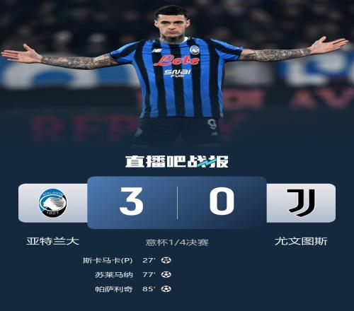 體育播報2月6日宣 北京時間2月6日04:00,意大利杯八強尤文圖斯挑戰亞特蘭大的比賽在藍色競技球場進行,上半場小孔塞桑抽射中楣,布雷默送點,斯卡馬卡點射首開記錄,下半場麥肯尼抽射造險,蘇萊馬納替補建功,帕薩利奇破門,最終尤文0-3亞特蘭大無緣意杯四強。